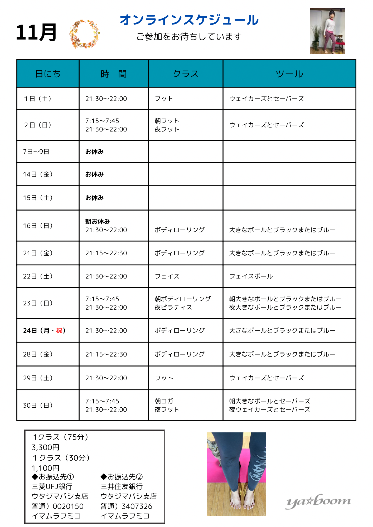 11月【オンラインスケジュール】 2025 10/31 お知らせ イベント 2025年10月31日 11月のオンラインスケジュールです 今月はヤムナ先生来日のため、お休みが多くなり申し訳ありません 24日(月・祝)の夜レッスンを追加しましたのでぜひご参加下さい 今月もよろしくお願いします お知らせ イベント 11月【コナミ大阪ステーション】ヤムナヨガ