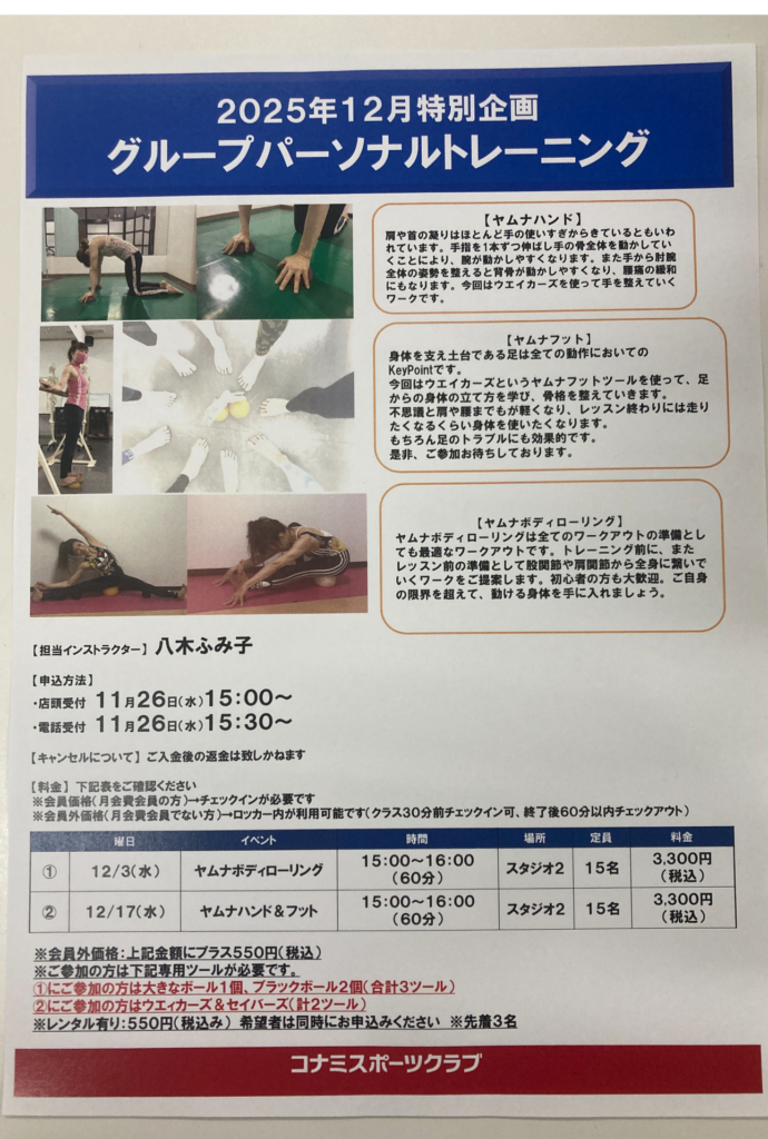 12月【コナミ大阪ステーション】ヤムナグループトレーニング 2025 11/27 お知らせ イベント ワークショップ 2025年11月27日 コナミスポーツクラブ大阪ステーションシティにてヤムナグループトレーニングを開催します。 ◎開催日 12月3日(水)、17日(水) 申し込み受付中 皆さまのご参加をお待ちしております。 お知らせ イベント ワークショップ 11月【オンラインスケジュール】 12月【サードスペース】ヤムナイベント
