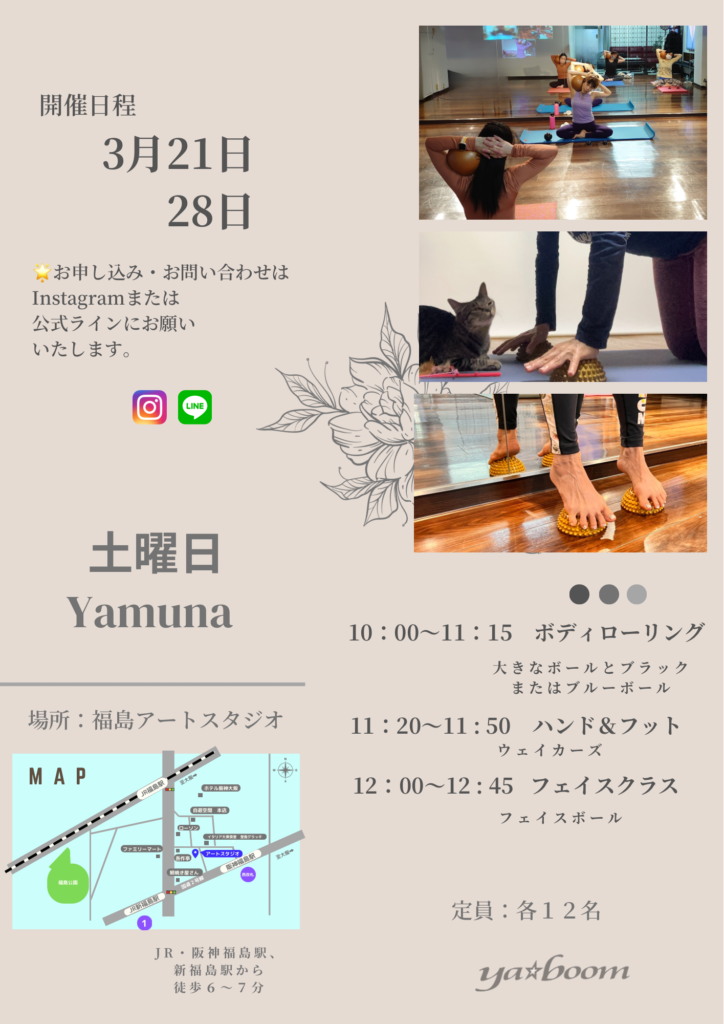 3月【福島アートスタジオ】ヤムナレッスン 2026 3/04 お知らせ イベント ワークショップ 2026年3月4日 福島アートスタジオでのヤムナレッスンのお知らせです。 ◎参加費 ・YBR75 3,300円(税込) ・フット&ハンド30 1,100円(税込) ・フェイスクラス 2,200円(税込) 詳しくはチラシをご覧下さい 皆様のご参加をお待ちしています お知らせ イベント ワークショップ 3月【オンラインスケジュール】